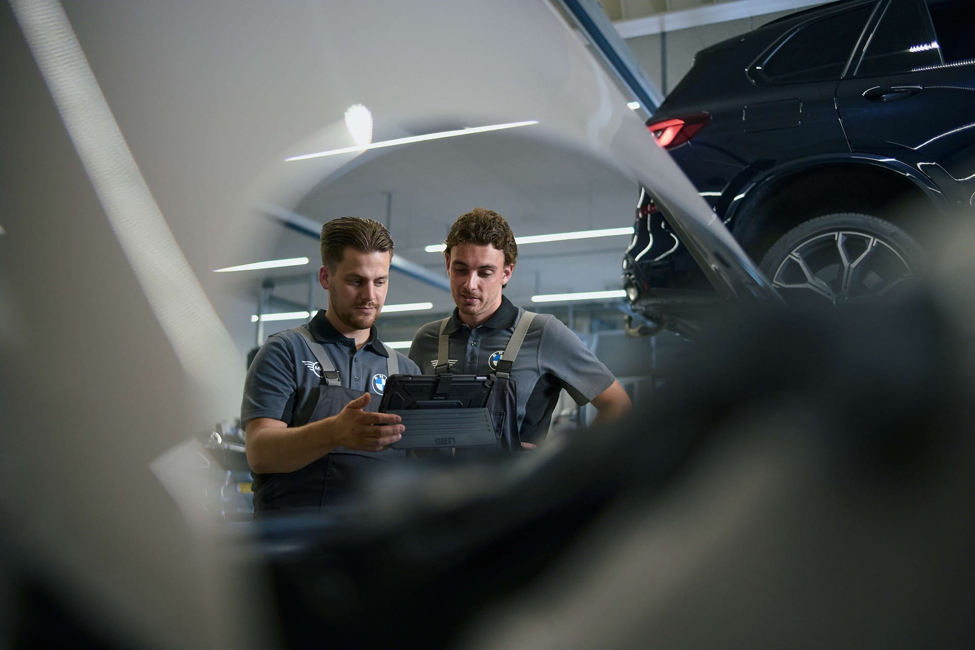 BMW monteurs lachend naar de camera.